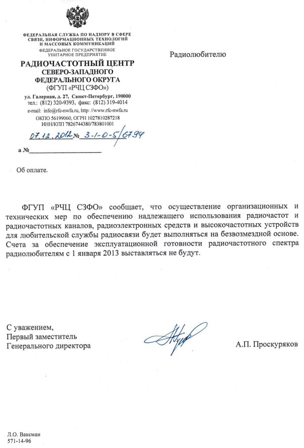 ФГУП "РЧЦ СЗФО" сообщает, что осуществление организационных и технических мер по обеспечению надлежащего использования радиочастот и радиочастотных каналов, радиоэлектронных средств и высокочастотных устройств для любительской службы радосвязи будет выполняться на безвозмездной основе. Счета за обеспечение эксплуатационной готовности радиочастотного спектра радиолюбителям с 1 января 2013 г. выставляться не будут.